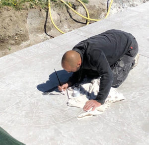 A la suite du coulage après un temps de séchage, nous venons « boucharder » c’est-à-dire frapper la surface du béton à l’aide d’une boucharde pointe diamant ce qui permet de révéler son aspect naturel.